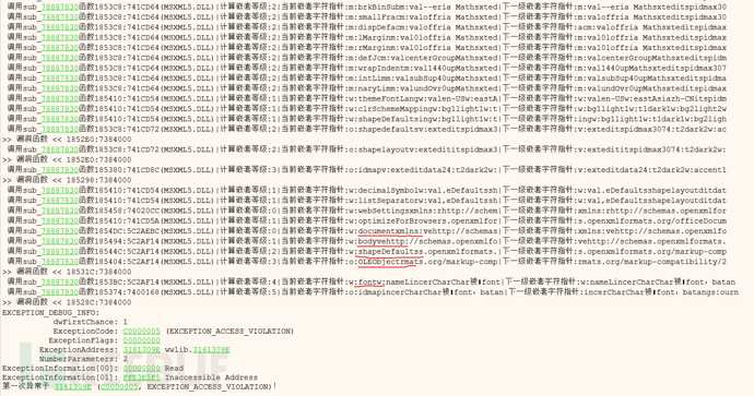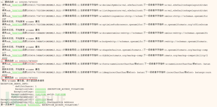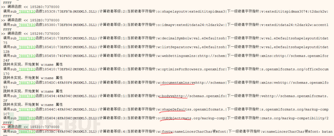 对漏洞函数下记录断点后查看日志内容,发现漏洞函数被调用了 6 次,结合 document.xml 文件中的标签元素分析漏洞函数很有可能是用于解析元素标签的,至于解析的是什么,目前还不清楚。