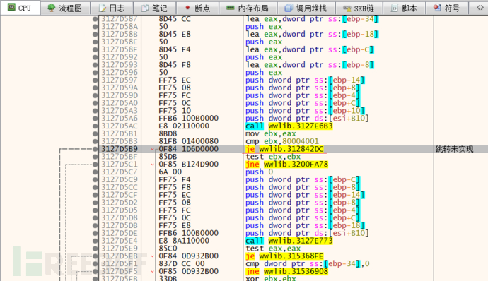 之后调用完 wwlib.3127E6B3 函数后会进行一个判断,如果 ebx 等于 0x80004001 就跳转。