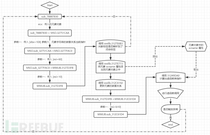接着分析一下 w:name 属性是何时被复制的。通过对漏洞异常处的分析发现 w:name 属性储存在元素对象中,通过对元素对象储存 w:name 位置下写入断点发现在 WWLIB.sub_3127D3FB 函数中会调用 wwlib.3127E773 函数复制 w:name 到元素对象当中,之后漏洞函数中会把 w:name 属性取出来进行虚函数表调用。