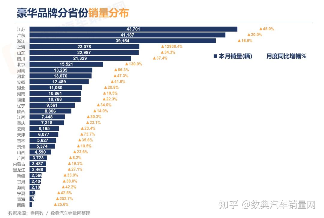2023年5月各省份豪华品牌汽车销量表现,江苏广东两地豪华车型销量超过4万辆,浙江豪华车型销量也达到3.9万辆,北京豪华车型销量增幅超过1.3倍;