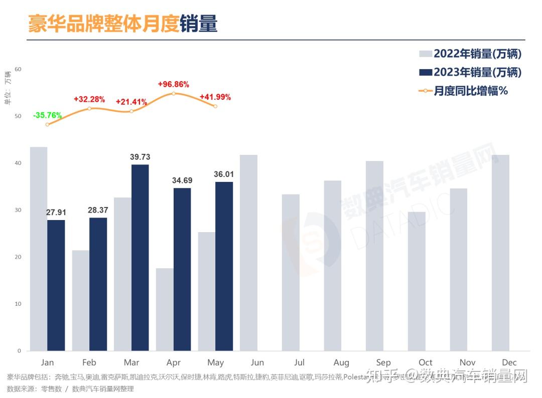 2023年5月,汽车豪华品牌合计销量36万辆,同比增长四成,环比增长3.8%,2023年累计销量166.7万辆,同比增长18.6%;