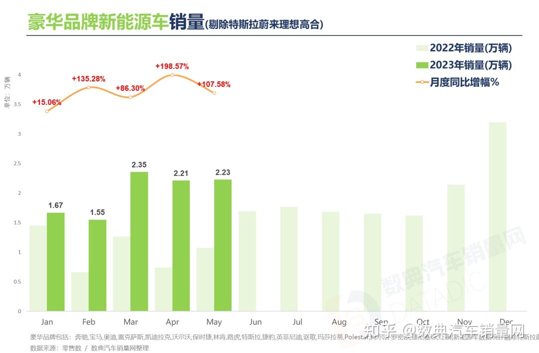 豪华品牌新能源车在2023年5月份销量2.23万辆,同比上升1倍,环比与上月持平;