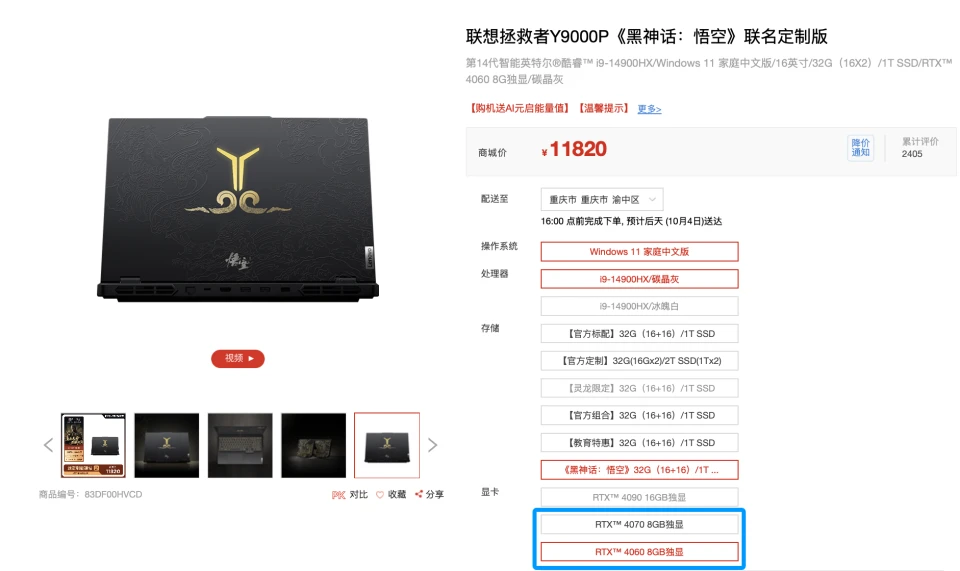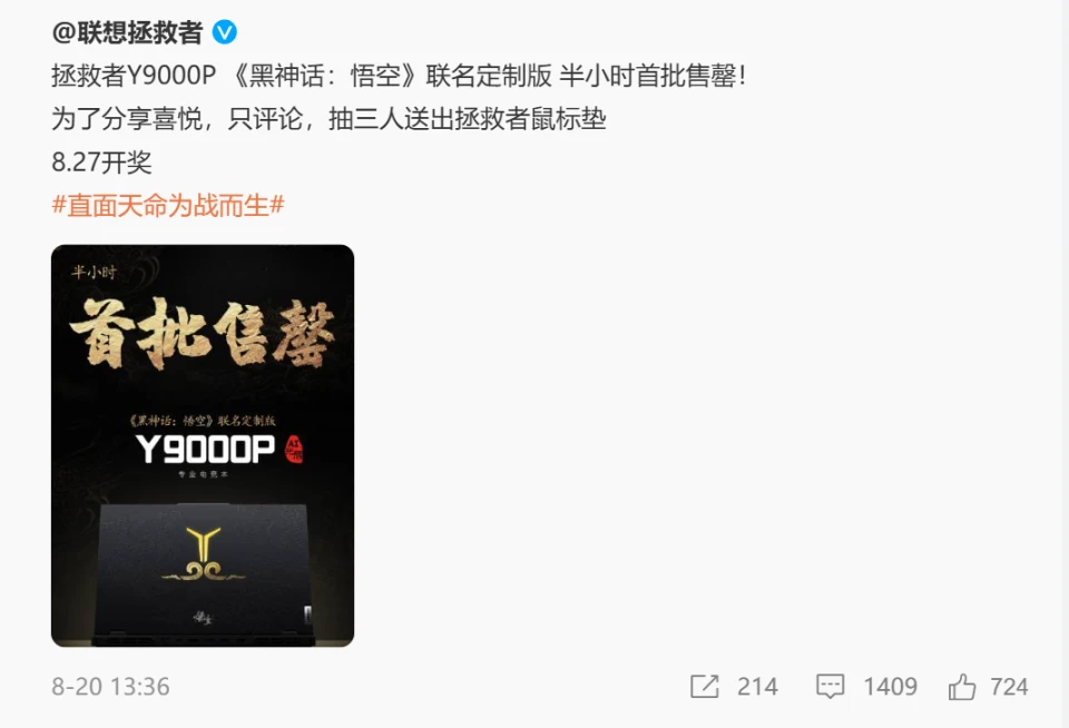 目前联想拯救者 Y9000P《黑神话:悟空》联名定制版已经在联想官方商城和联想京东自营店铺开售,感兴趣的小伙伴可以前往查看详情。