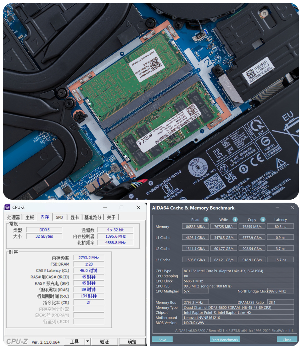 组成 32GB 双通道内存。通过 AIDA64 的内存测试之后可以看到,内存时序为 46-45-45-89 CR2,读取速率为 86535MB/s、写入速率为 76725MB/s、复制速率为 76855MB/s、时延 80.8ns。 L3 Cache 的读 / 写 / 拷贝数据分别为 1505.6GB/s、621.21GB/s、918.91GB/s、时延 15.7ns。有条件的同学可以把内存升级为 64GB 的双通道 DDR5。