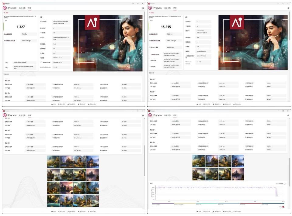 场景中,测试会创建 4 批 512×512 分辨率的图像,每批次 16 幅,整机测试得分 1327 分,图像生成速度为 4.710s/image,总体消耗时间 75.355s。