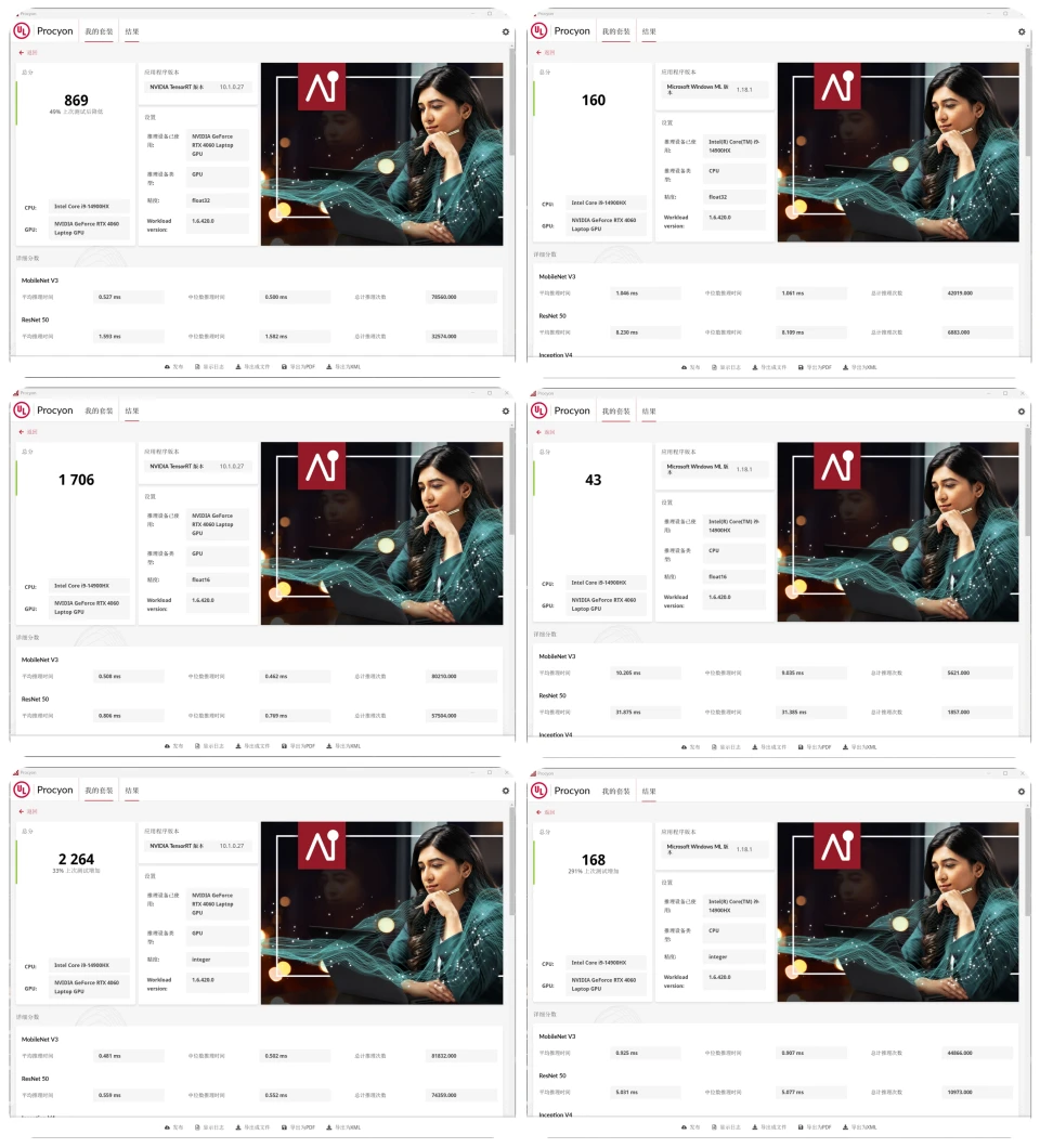 先来看看 Procyon 的 AI 视觉测试套件,通过测试可以看到联想拯救者 Y9000P 的 i9-14900HX + RTX 4060 取得了不错的成绩。