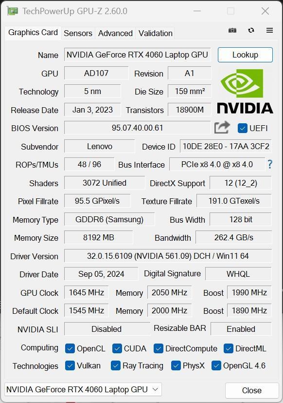 因为众所周知的原因,今年的移动端显卡并没有迭代,所以各大游戏本也只能沿用 CES 2023 时发布的 RTX 40 系列。联想拯救者 Y9000P 2024 就拥有 RTX 4060 / RTX 4070 / RTX 4090 三种显卡版本,不过黑神话联名款就只有 RTX 4060 和 RTX 4070 版本,本文测试的就是前者。