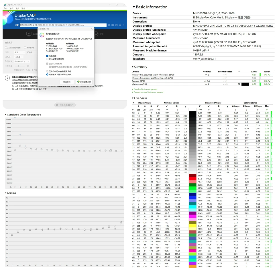 校色后检测,可以看到屏幕色域覆盖了 99.5% sRGB、87.8% Adobe RGB 和 96.2% DCI-P3,平均色准 0.06。屏幕实测亮度 474.7nits,伽马曲线为 2.2 光度,白点为 6562K。对比度达到了 1107.3:1,色准表现方面,经过校色之后 51 个色块检测下的平均 △E = 0.21,最大 △E 差值为 0.81。
