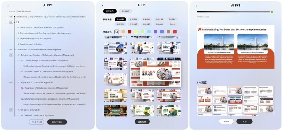 喂了一个,它就直接梳理出了文章的大纲内容,然后再根据你所选择的模板,生成了 PPT 内容,真的很方便。