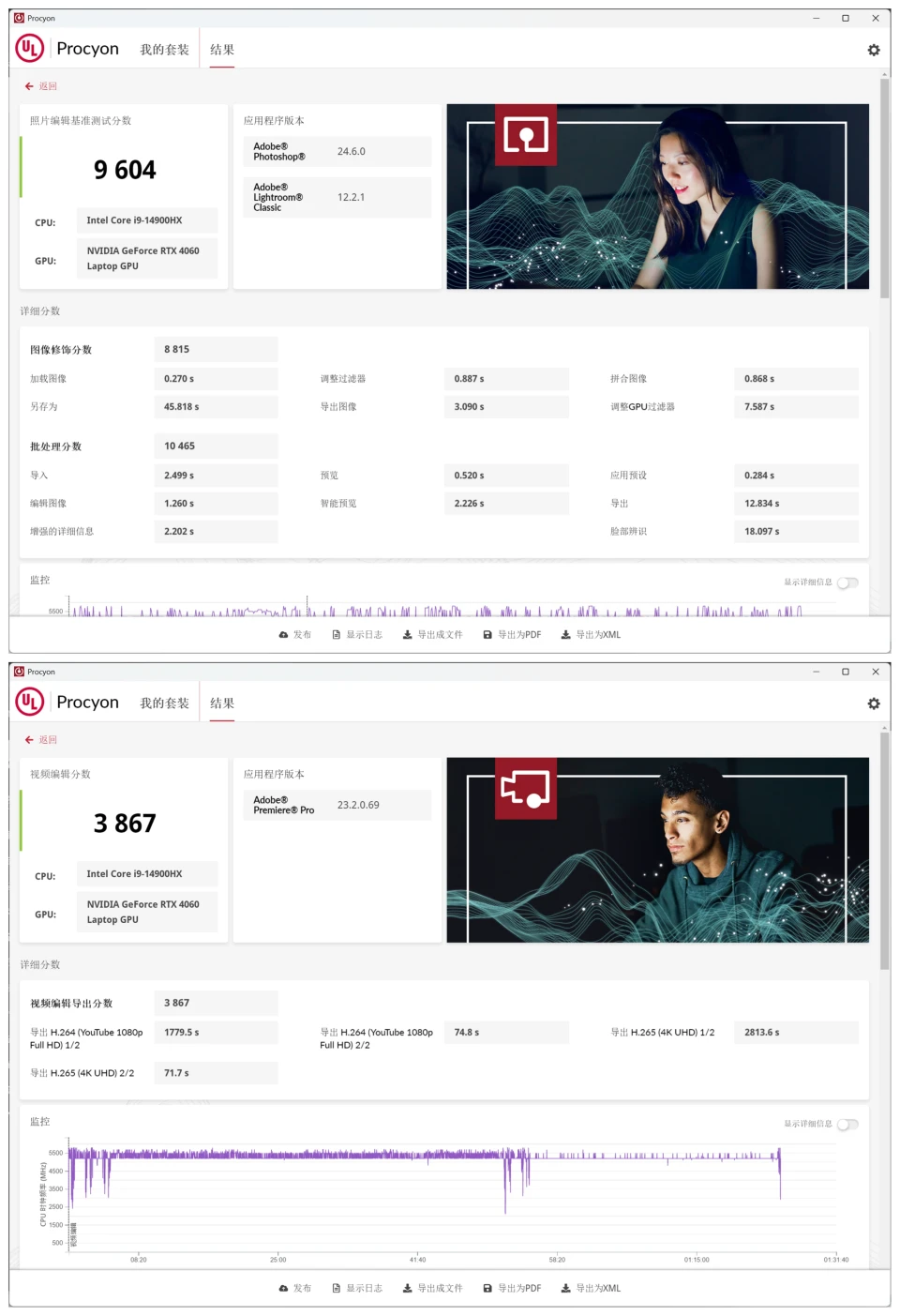 在图片处理与视频剪辑的性能表现方面,我使用了 Procyon 进行了测试。在 Adobe Photoshop 和 Lightroom 的