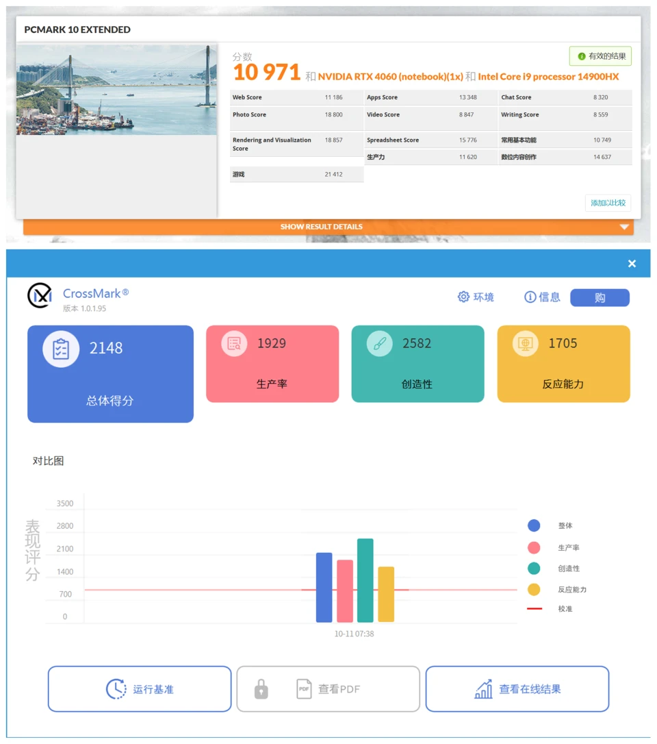 的基准测试场景中,总体得分 10971 分,基本功能得分 10749 分,生产力得分 11620 分,数位内容创作得分 14637 分,游戏得分 21412 分。