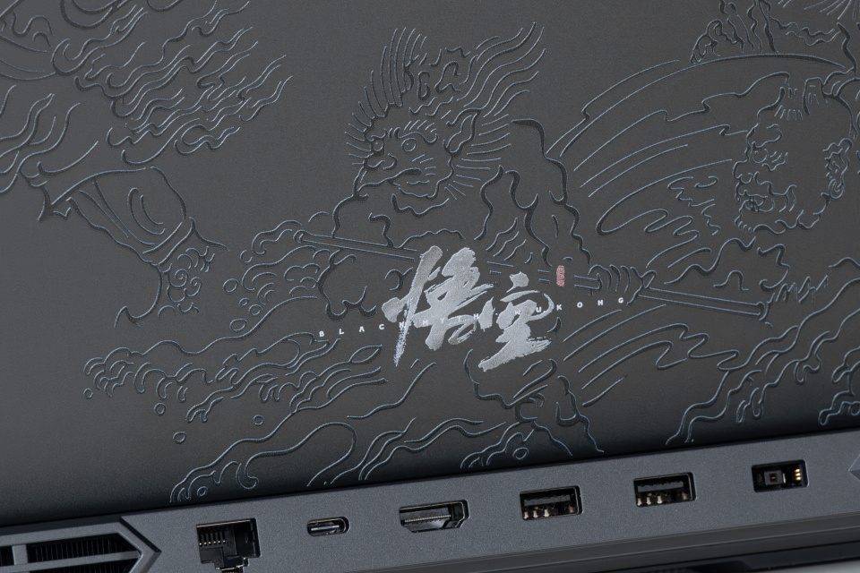 回到产品本身,再仔细观察电脑的 A 面,还可以看到大面积的壁画纹理,主题应该是悟空大战诸天神佛妖魔的场景。正下方还有一个《黑神话:悟空》的游戏 Logo,这辨识度拉得满满的。