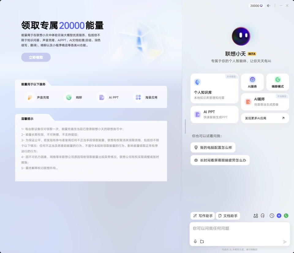 初次使用时,联想小天会让你领取专属的 20000 能量,用以支付服务,约等于算力的兑换,1000 能量约等于 ¥1,当然本地的模型是不用支付的,很多 AI 工具的文生图是有次数限制的,但联想小天就可以随便用。