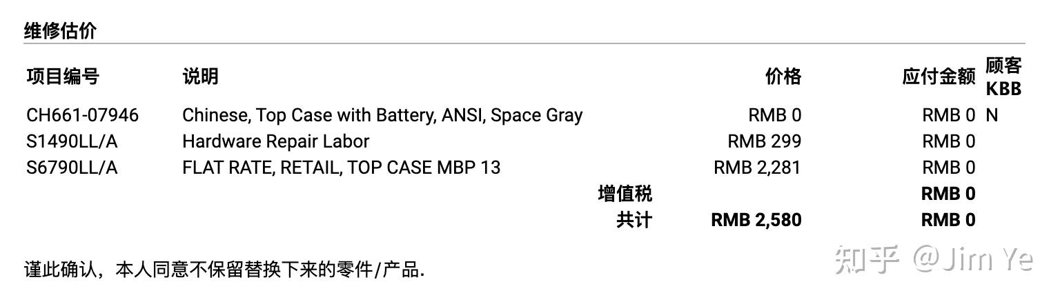 看到这里显示 更换“TOP CASE MBP 13”费用需要2580元 ,这应该是电池、键盘和触摸板套件一起的价格,可我当时询问过店员,如果没有在保修期, 自费大概要1400左右 ,很是疑惑。