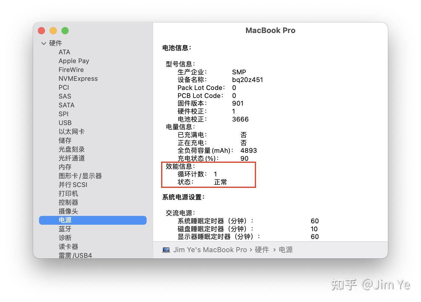 从屏幕角落的苹果菜单 中选取“关于本机”,点击「概要」,点击「系统报告」,左侧选择”硬件“/"电源",在右侧可以看到现在电池的状态显示”正常“,循环计数也只显示1次(这1次是他们在换好电池后做的完整充放电测试):