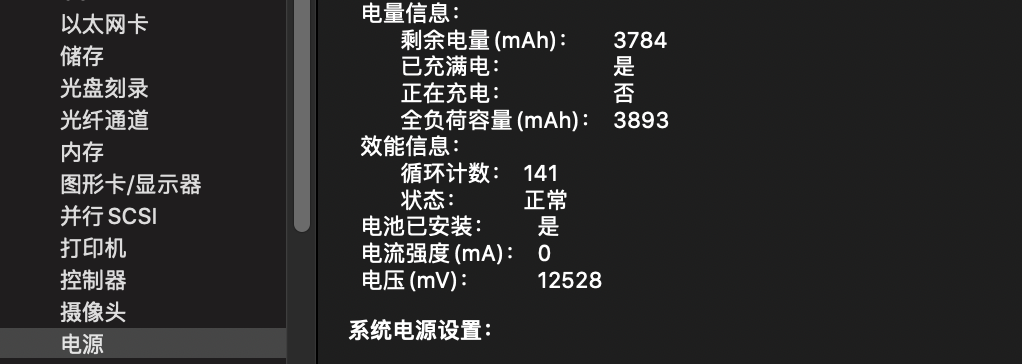 点击屏幕左上角「 苹果logo 」-- 「 关于本机 」-- 「 系统报告 」-- 「 电源 」,在电池信息里就可以看到电池的循环计数还有电池的剩余容量