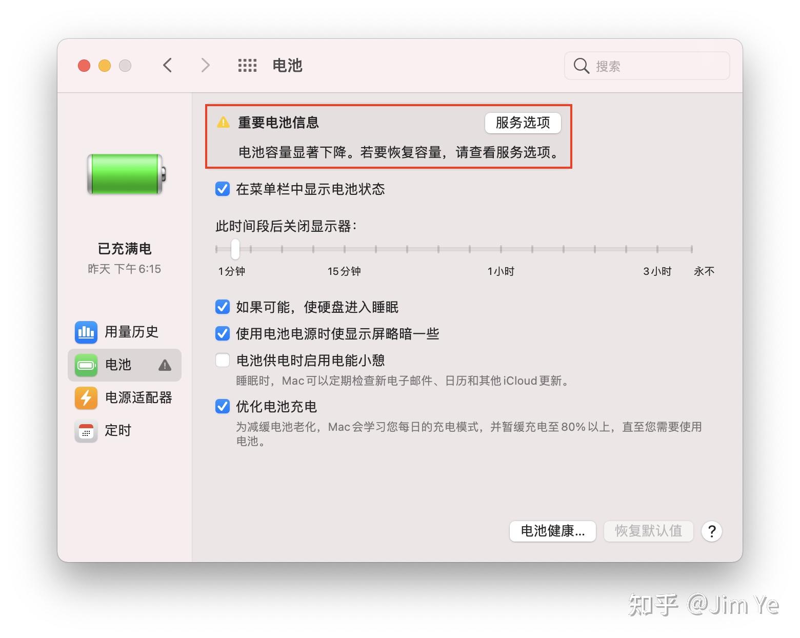 另外,点击「电池偏好设置...」,还看到“电池容量显著下降。若要恢复容量,请查看服务选项”: