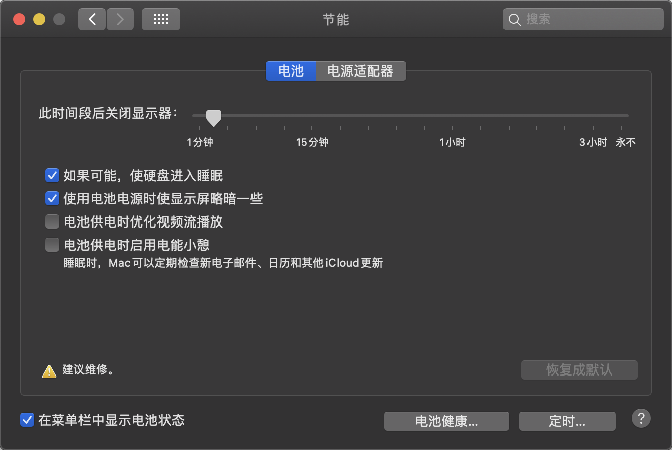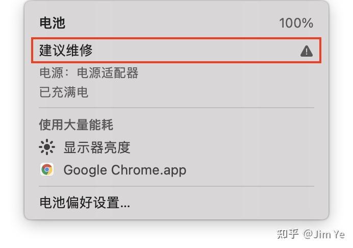 建议维修:电池的蓄电能力低于新电池,或者电池无法正常工作。虽然您可以继续安全地使用 Mac,但 您应该将它带到 Apple Store 商店或 Apple 授权服务提供商处做个电池评估。