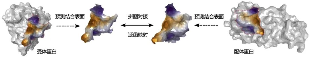 图:「蛋白质拼图」流程示意图:模型首先预测两个蛋白质之间的结合表面区域,再利用神经网络所学函数的匹配性实现高选择性的拼图。