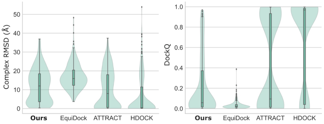 图:「蛋白质拼图」模型(显示为 ours)和基于三维图神经网络的深度学习模型 SOTA (EquiDock) 以及传统刚性分子对接模型 ATTRACT 和 HDOCK 的比较。Complex RMSD 越小、DockQ 越高说明预测的蛋白质复合物结构越接近真实结构。