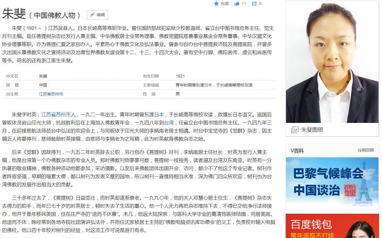这个是最让我气愤的,某北京企业将无关人物的免冠照安插到了我已逝外曾祖父朱斐居士的百科头像上,以至于我
