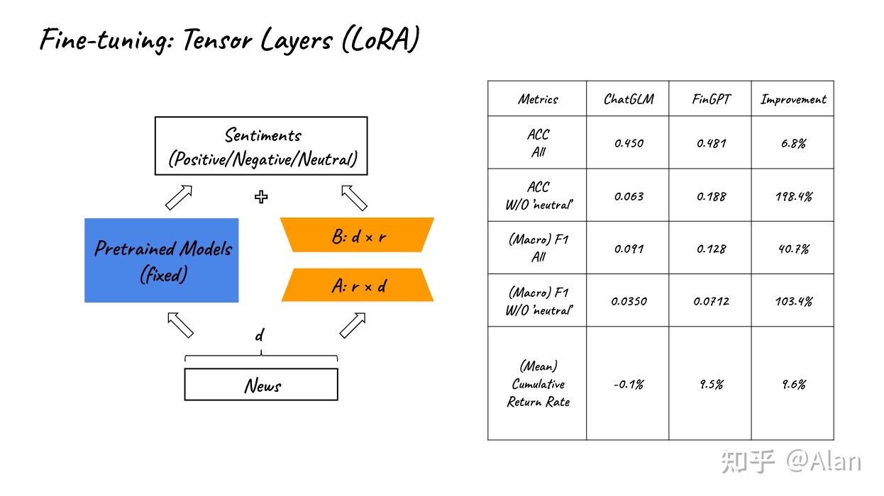 - 在FinGPT中,我们使用新的金融数据集对预训练的LLM进行微调。高质量的标记数据是许多成功的LLM(包括ChatGPT)的最重要的关键之一。