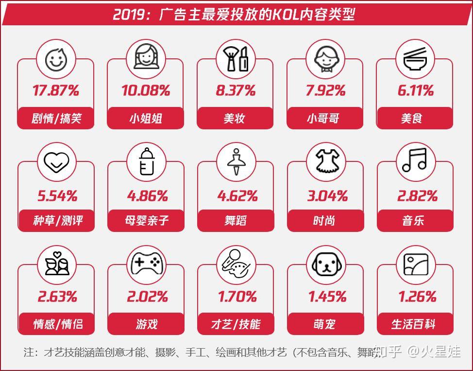 ▲2019年1-10月:广告主最爱投放的KOL内容类型,数据来源:卡思数据,数据为卡思商业版“品牌追踪”功能采集到的品牌在抖音、快手投放数据,不代表平台官方