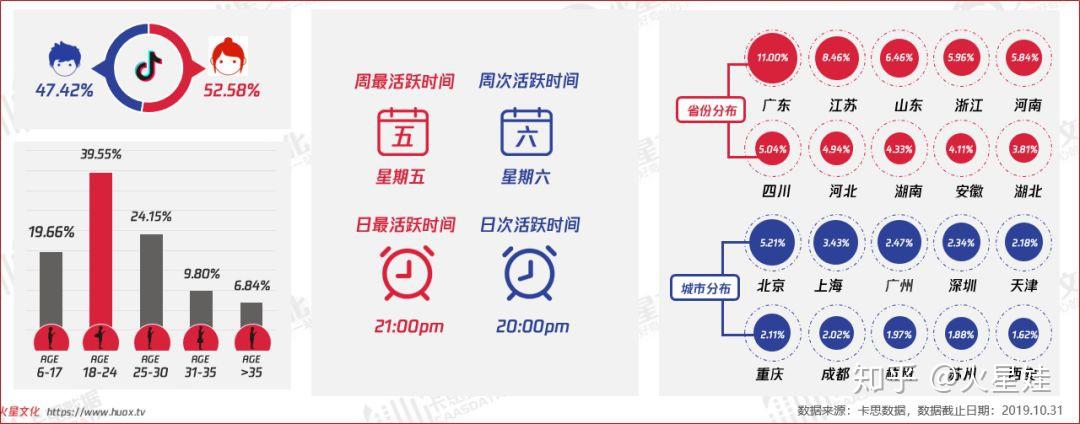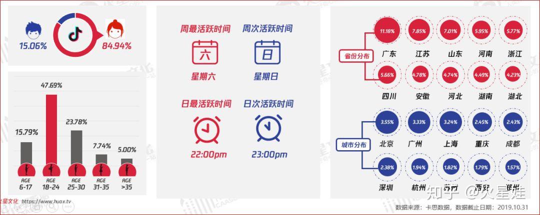 电商品牌用户画像与抖音KOL粉丝画像十分趋近,实际上也代表最广义的抖音受众,18-24岁的年轻用户占比最多;从活跃时间上看,电商用户在周五、周六最活跃,可见一到周末,用户就开始“买买买”模式,根本停不下来;从活跃省市来看:中部和沿海省份占比更高,以一线、新一线城市最活跃。
