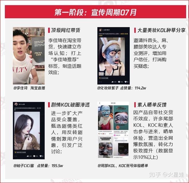 如品牌:珀莱雅,自19年7月起,珀莱雅泡泡面膜上架李佳琦直播间,快速建立市场认知,并以“李佳琦推荐”标签展开第一轮话题打造;紧接着邀请大量头肩腰部美妆KOL通过专业测评,增加用户信任,扩大产品影响力,强化口碑。再利用剧情类KOL,进一步扩大产品受众覆盖,用反转剧情刺激用户兴趣,引发广泛讨论;最后,用素人晒单反馈营造出全网爆款氛围,转化力极致提升。至此,完成了珀莱雅泡泡面膜第一阶段传播。