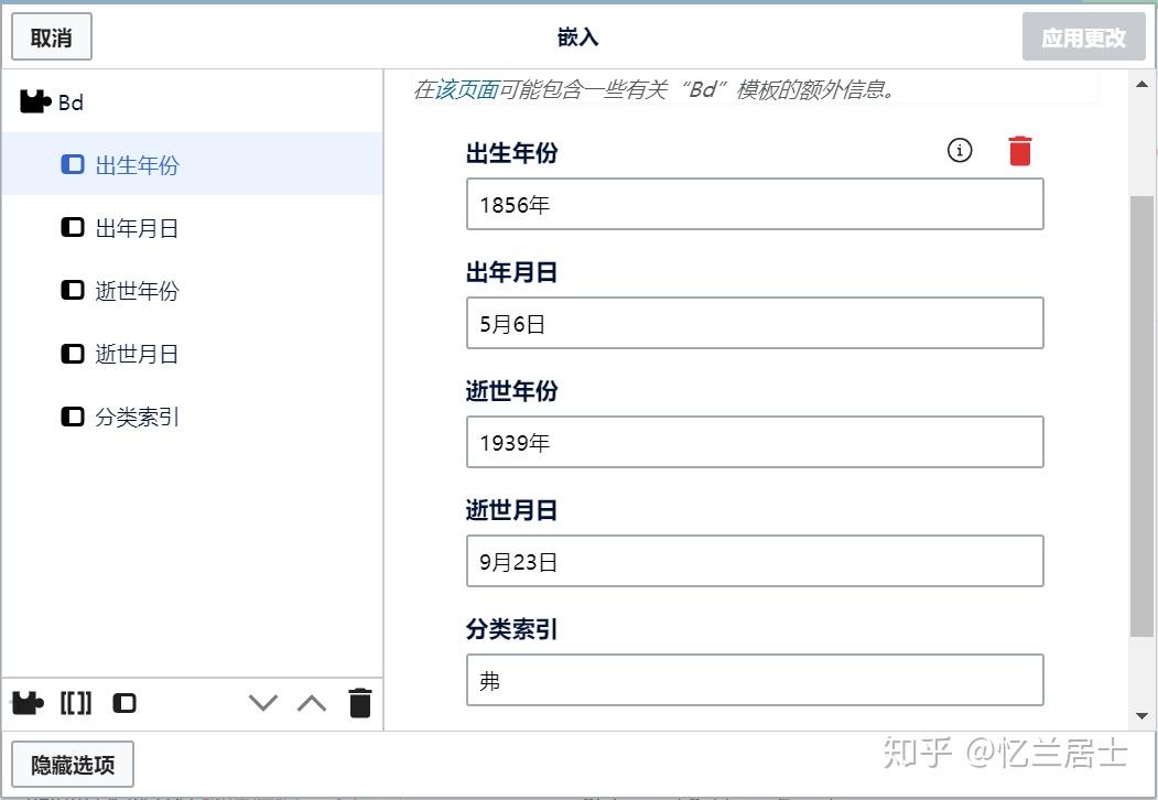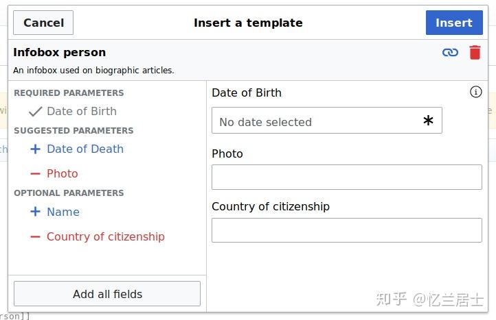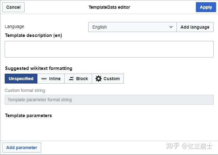 配合可视化编辑器使用的一大利器,加入模板数据之后,可以自动生成模板参数表方便用户查阅,更重要的是在编辑条目时可以方便快速地添加数据。