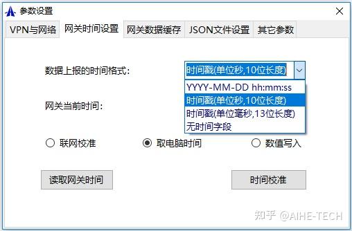 上报到服务端的JSON默认会带一个上报时间字段,根据上图可修改字段名称,同时也可以选择时间格式,通过'参数'->'校准网关时间',打开以下窗口: