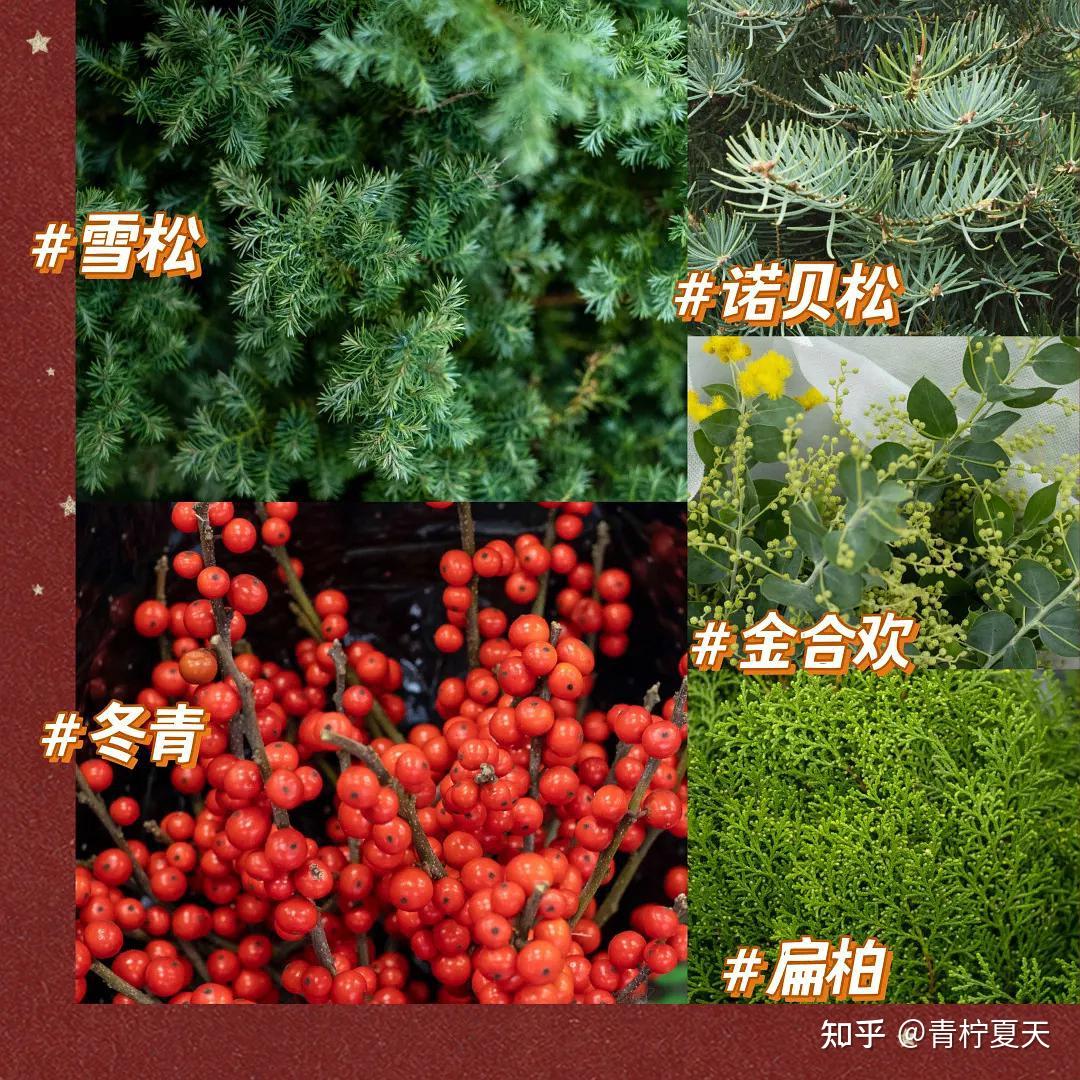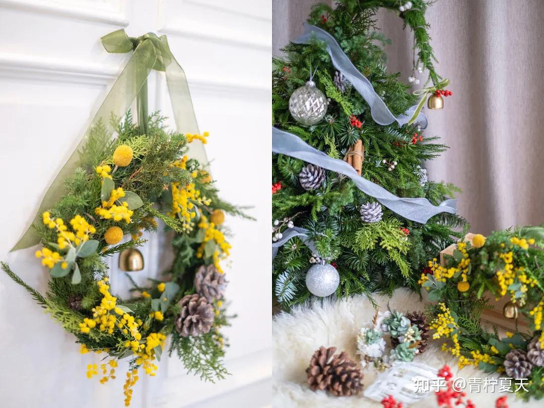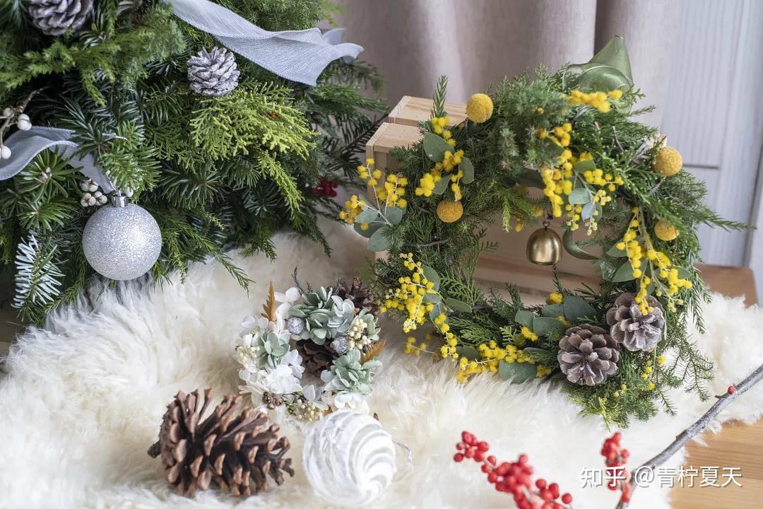 这次用到了四种松柏材料, 手头材料有限的同学,使用一种也可以,装饰物都是捡手边方便的材料即可。