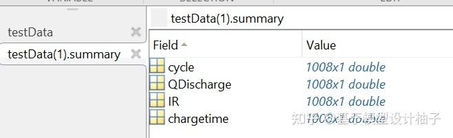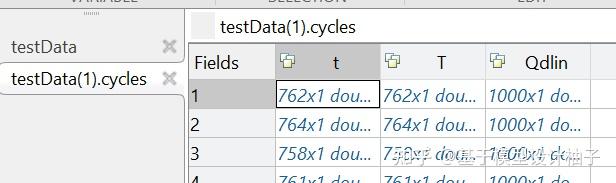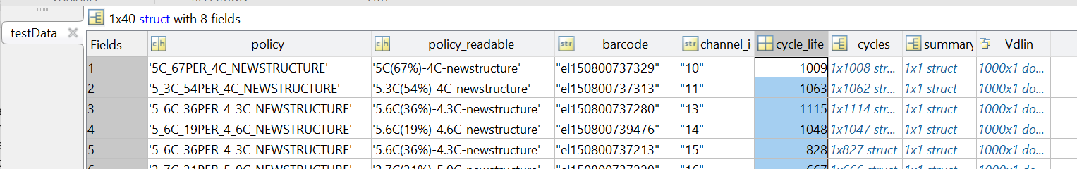 比如 testData 这个结构体,1*40,表示有40个电芯数据,每 一行对应一个电芯从新到老的循环 数据。
