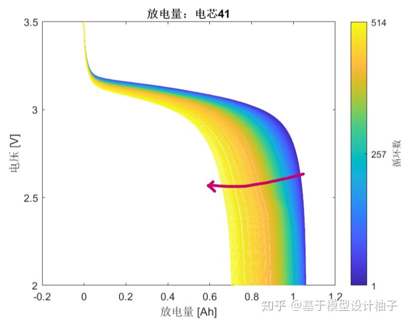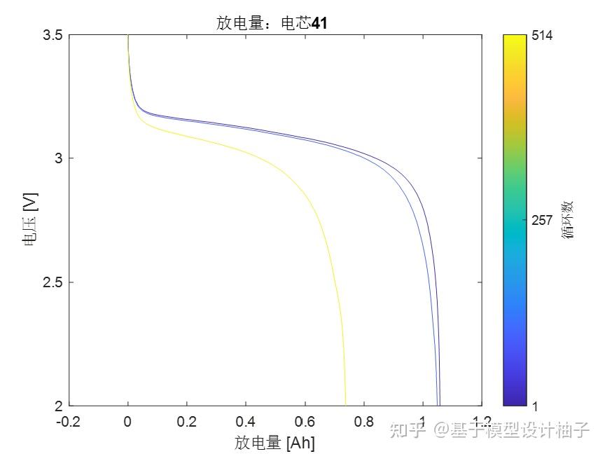 这是第41个电芯的所有循环的QV曲线合集。看图例,从蓝到黄色循环次数越大。也就是说,电芯越老,这条曲线越往左飘。