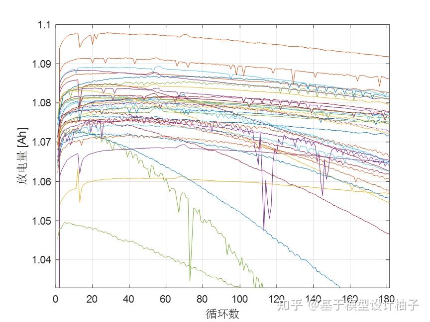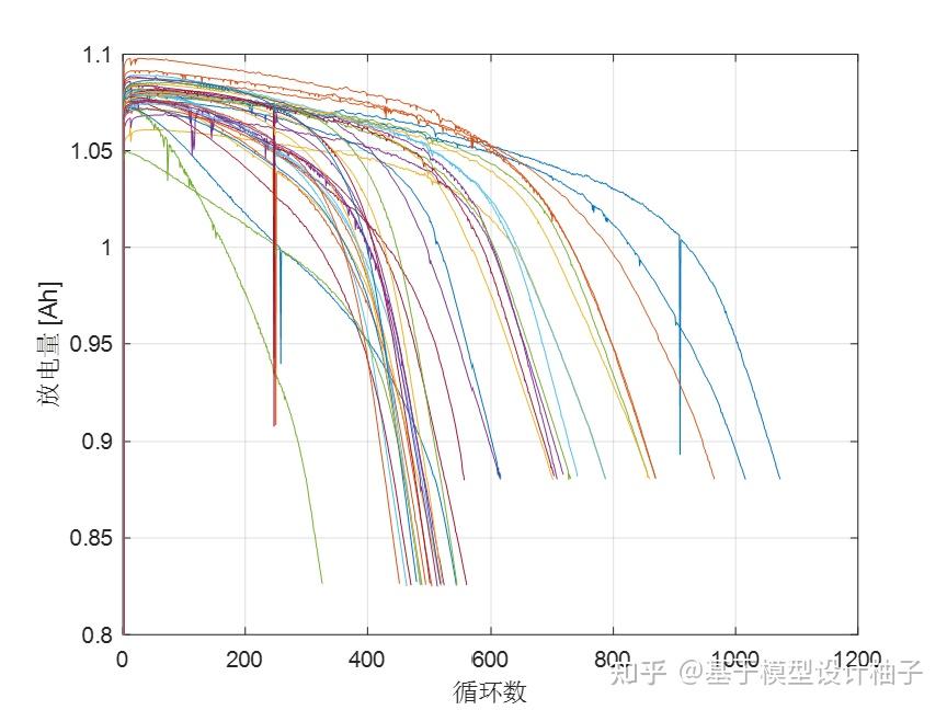 下面这个代码把各个电芯前1000个循环的放电容量画出来,观察放电容量在生命周期中是如何衰减的。