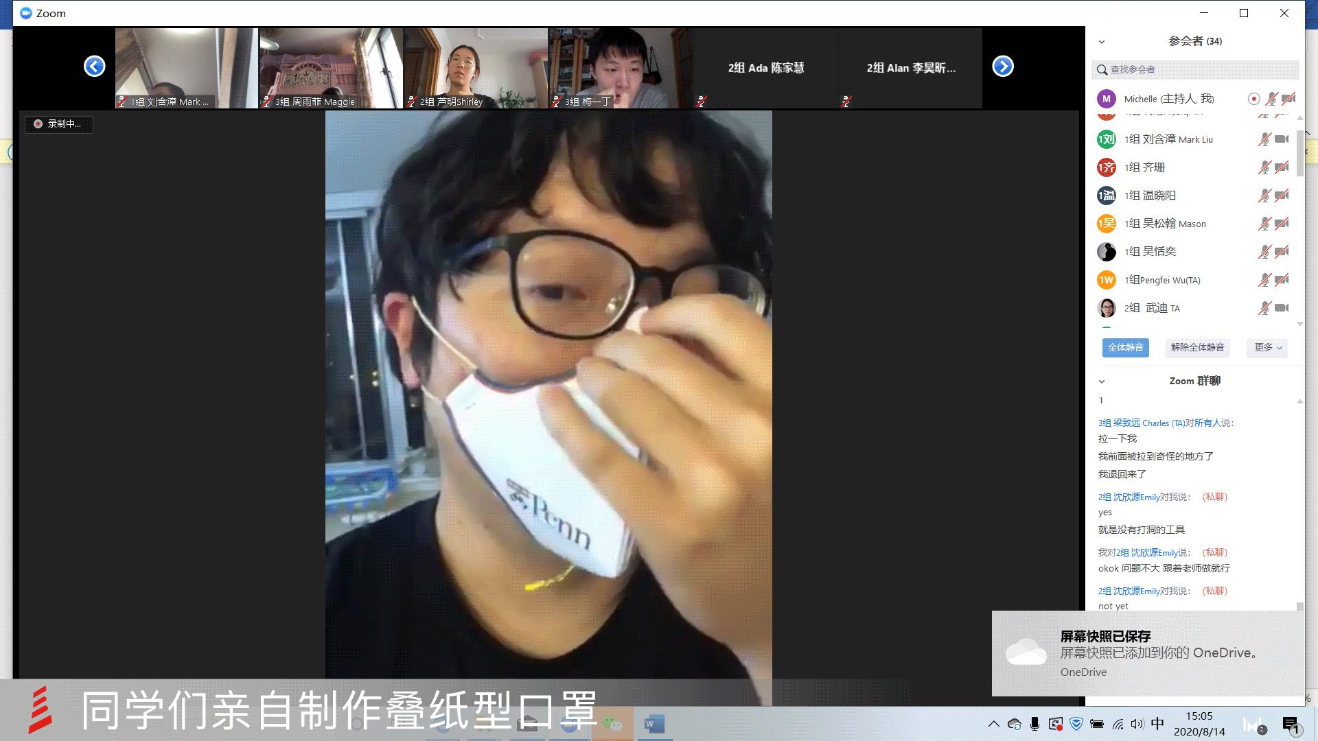宾大杨教授为同学们讲解了材料科学在对抗新冠病毒中发挥的作用,给同学普及专业知识,提高同学的讲解能力和理解能力。同学们也尝试了亲自动手,制作叠纸型口罩。