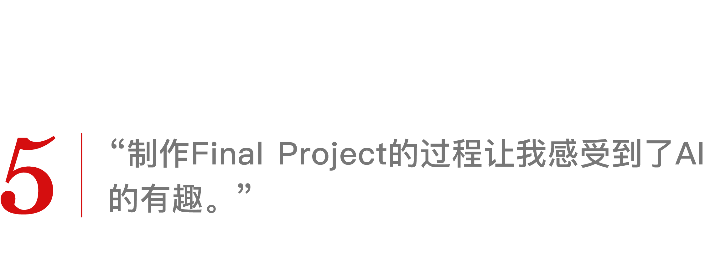 如何将脑洞大开的课题变为现实?在制作Final Project的过程中,课程中的“硬核干货”与实践结合,让同学们亲身感受到了AI的乐趣:看似高深莫测的知识,其实完全可以应用在日常生活中。