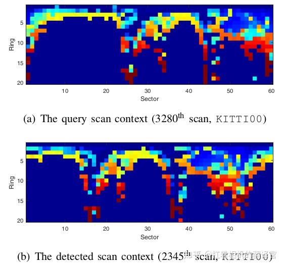 图中(a)和(b)为同一场景下的两帧数据所形成的Scan-Context,可以看出,两个矩阵图像除去水平方向的位移偏差外,是高度相似的。这就是刚刚提到的“旋转不变性”;
