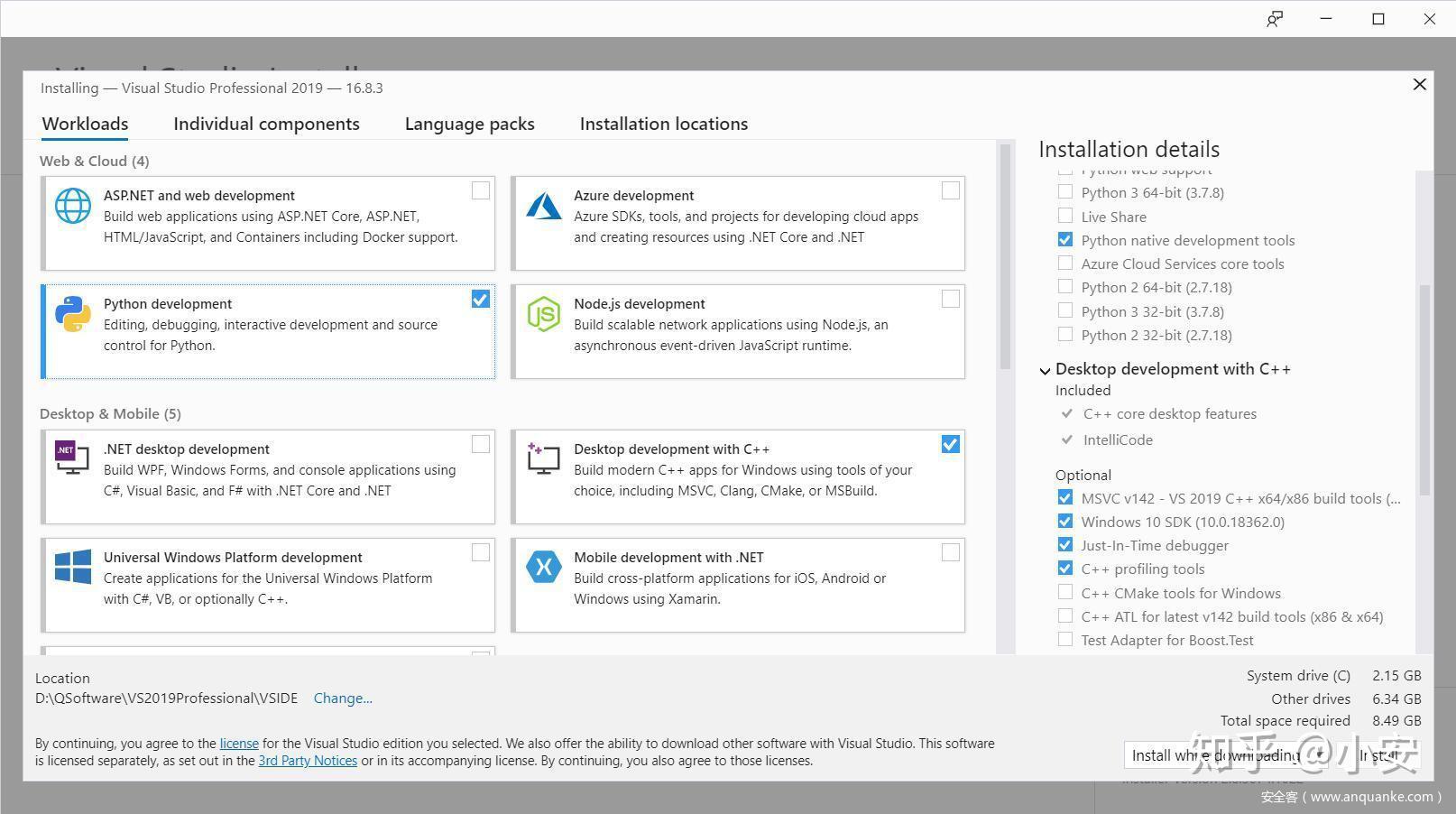 安装情况:仅安装在 Visual Studio 中进行开发所需的工具和组件捆绑包。