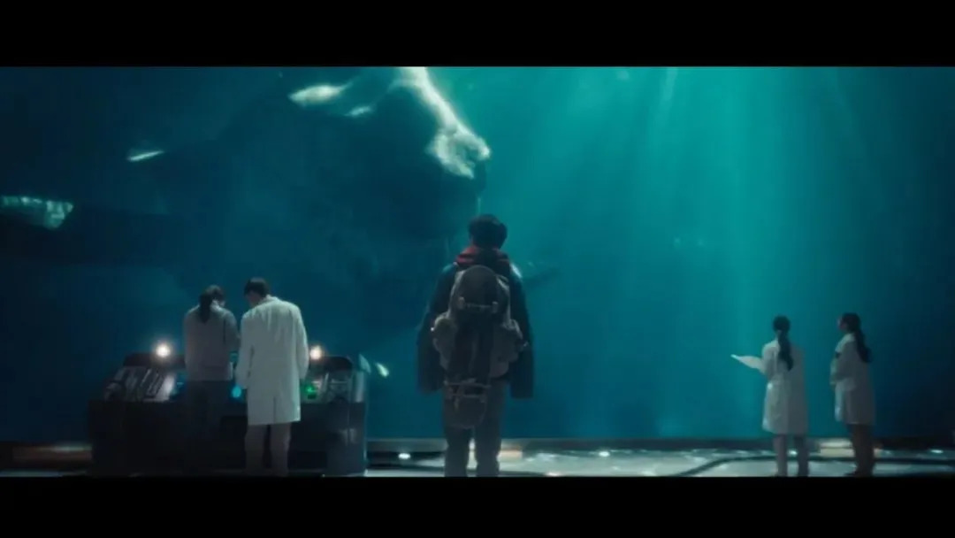 在海洋馆,有四名科学家也一直在观察着巨型海兽,很有《巨齿鲨》那种惊艳感!