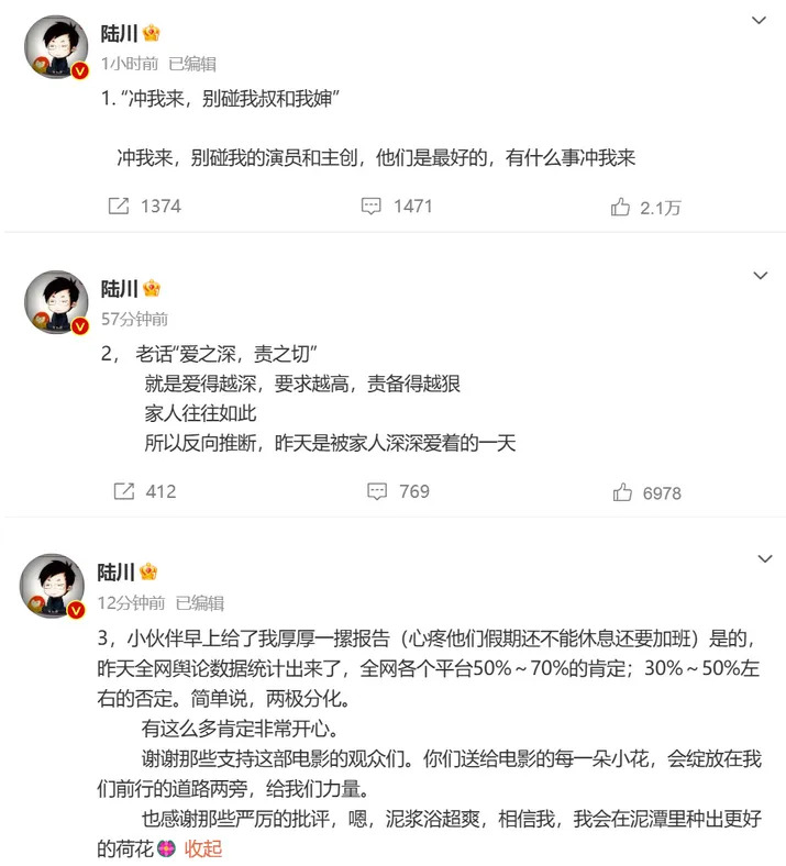 导演陆川在社交平台发文回应争议:“冲我来,别碰我的演员和主创,他们是最好的,有什么事冲我来。”