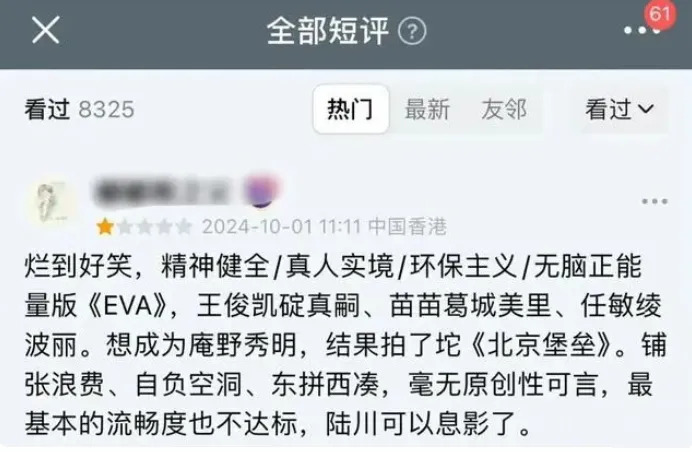 目前,有人大骂这片是无脑正能量版《新世纪福音战士》,就连每个角色都能对应动画中的角色,大骂陆川铺张浪费、自负空洞、东拼西凑,香橙味奄野秀明,结果拍了坨《上海堡垒》。大骂他可以息影了!