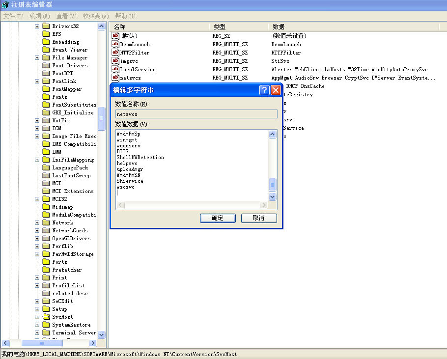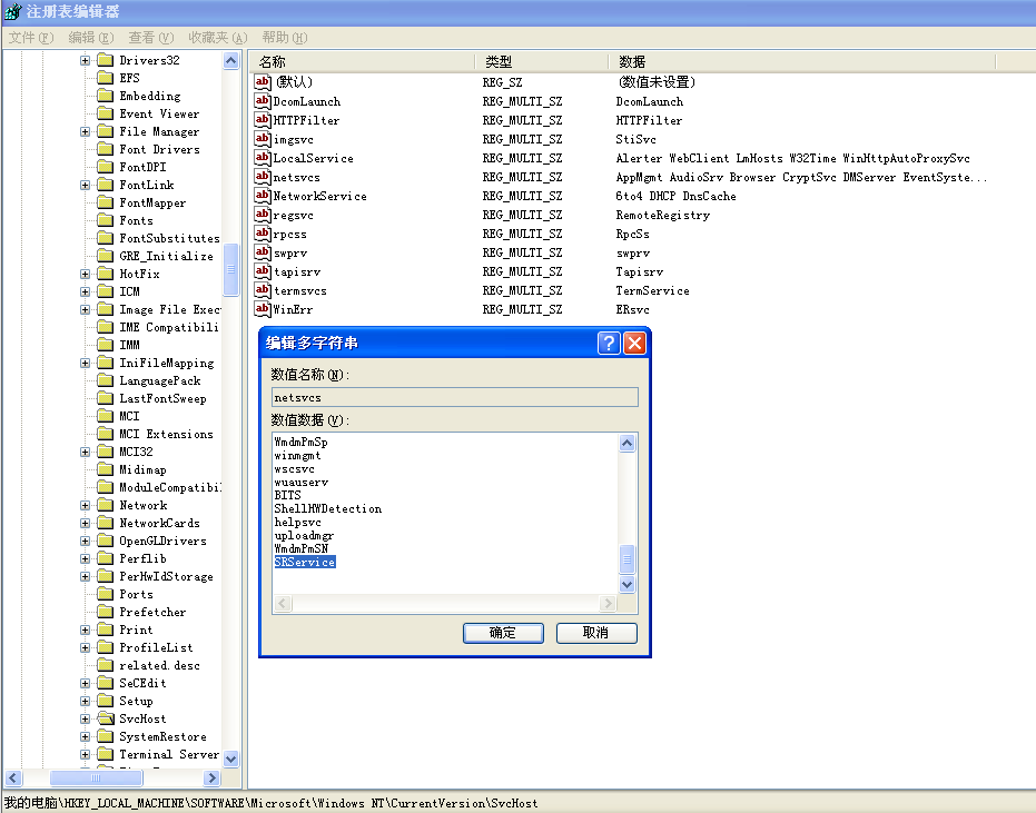 双击netsvcs,在末尾添加一行“SRService”,然后确定。