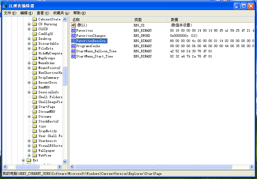 (当前用户)位于 HKEY_CURRENT_USER\Software\Microsoft\Windows\CurrentVersion\Explorer\StartPage 中的 FavoritesResolve