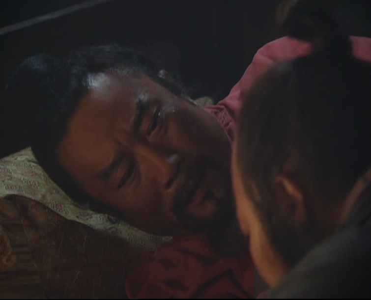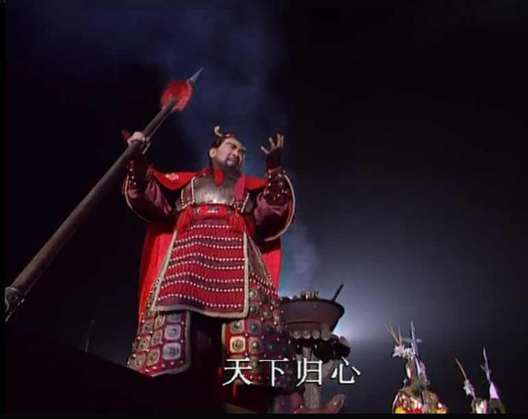 最后这个仰拍镜头用得极好,一代枭雄欲天下归心的雄心壮志和舍我其谁的霸气,呼之欲出!其效果比之20多年后的今日许多自谓“史诗大片”的影视剧的效果毫不逊色: