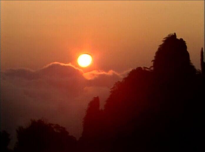 画面,一轮红灿灿的朝阳,偎着山巅,从云霞中喷薄而出,片头定格于神秘而美丽的山林之中: