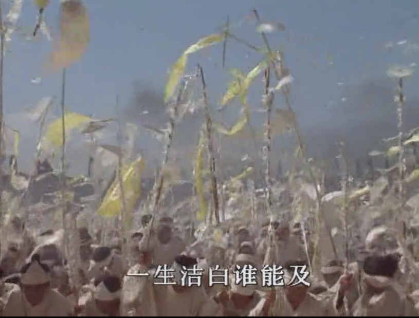 最后再来说说片头和片尾曲。片头曲为明代杨慎作词、徐沛东谱曲、杨洪基演唱的《临江仙·滚滚长江东逝水》。此曲知名度之广泛、历史感之深沉苍凉、乱世烽烟之大气震撼,在中国电视剧史上都可排得上前列。浑厚的鼓声,大军震地的喊杀声,萧萧的马鸣,滚滚的狼烟,配上厚重有力的配乐和大兵团作战的场景,几乎不用看画面就瞬间把人带入那个波澜壮阔的时代,三国的几次大战役如官渡、赤壁、夷陵、七擒孟获等在此均有展现,但在正式歌唱之前,并无一位英雄出现正脸,为何?有意制造一种距离感和神秘感,让观众把注意力集中于沧桑的历史感而非个别演员(此既是老三国之长又是其短,长在其历史感营造得非常好,短在沧桑厚重有余但英雄的年轻阳刚和故事的精彩跌宕略显不足),个人尤其喜欢这幅画面,小时候三国给我留下印象最深的就是他了,镜头由近及远,大有万国来朝、英雄辈出的大时代气象: