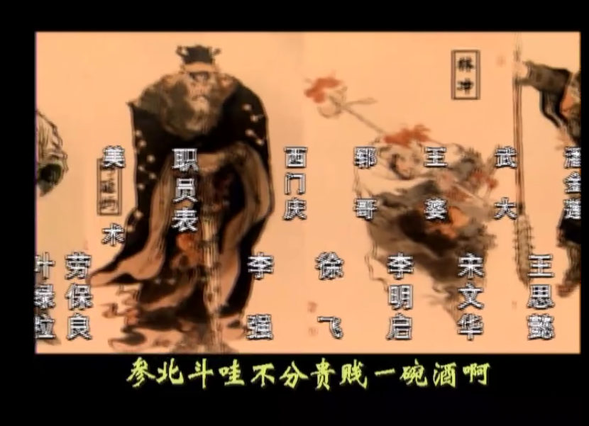 水浒终究是一出大悲剧,国母(今日看来,这才是此曲最大亮点……)的《天时地利人和》与《好汉歌》不同,把水浒故事放在历史的长河和民族的魂魄中加以咏叹,一种悲凉而不悲哀,磅礴而不失反思的从容与大气游荡其中: