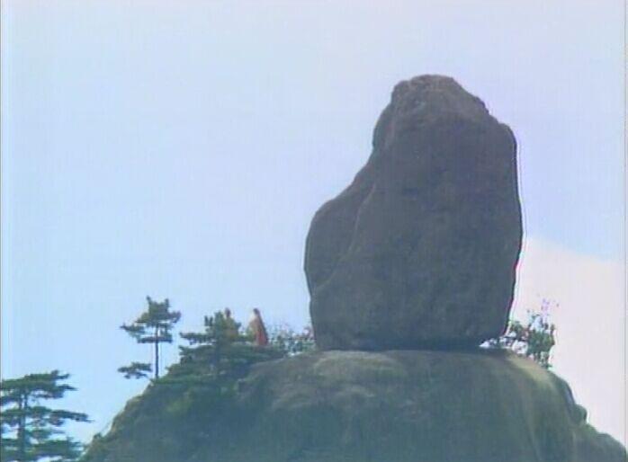 片名消失,镜头固定于顽石之上,其左侧隐约可以看到那一僧一道。女声继续响彻天地,画面固定之后,这声音仿佛愈加显得空旷,辽远,深邃,仿佛看到一个哲人兼诗人的角色,站在在茫茫的苍穹之下,苍苍的群山之中,仰望着辽阔无垠的天宇,古今的兴衰成败在他的脑海中如过眼云烟层层荡去,繁华的大厦忽剌剌倾倒,美丽的生命与爱情顷刻间如心般破碎,为什么,为什么。。。歌声中,仿佛听得到他的天问,他的深邃,他一生的心血与感悟;又仿佛听得到,那因高之莫及的天意所无法改变而带来的超脱与淡定;仿佛看得到,那茫茫五千年,纵横九万里的悲欢歌哭,风霜雨雪,都化做他心胸中一缕缕思索的云烟,都融入进这深幽渺远的歌声中……
