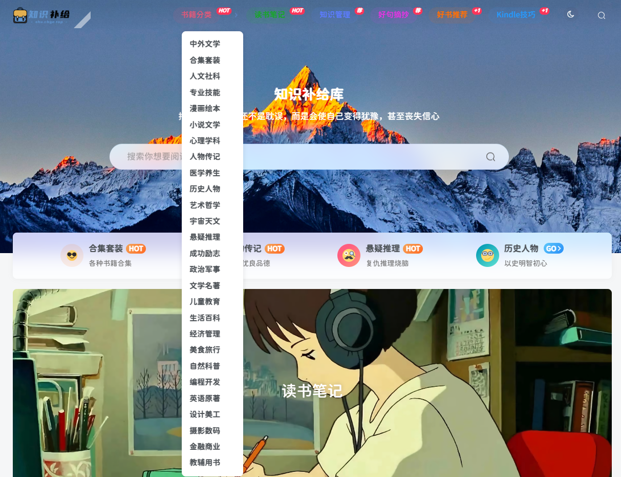 这个网站全都是高质量书籍的推荐,按照书籍类型、行业需要、学习干货、漫画绘本以及合集套装等标签分类,对电子书进行了进一步的细分,能让你花更少的时间找到自己所需要的书籍,包括 mobi、epub、azw3 等格式!